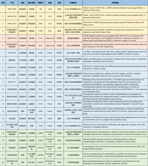 在肺癌、妇科肿瘤、淋巴瘤、膀胱癌、头颈肿瘤、黑色素瘤、肉瘤、鼻咽癌、脊索瘤、唾液腺癌、胸腺癌、硬纤维瘤、涎腺导管癌等其他多个疾病领域,卡瑞利珠单抗、阿帕替尼、阿得贝利单抗、吡咯替尼、达尔西利、氟唑帕利、法米替尼、SHR-1501、瑞拉芙普-α(SHR-1701)、SHR-1826、瑞康曲妥珠单抗(SHR-A1811)、SHR-A1912、SHR-A2102等抗肿瘤创新药相关研究一共入选了4项口头报告、2项快速口头报告、11项壁报展示和4项线上发表,彰显了PA电子医药强劲的研发实力。此外,昂丹司琼口溶膜在防治化疗导致的恶心呕吐方面展现出了良好的疗效,本次ASCO年会有1项研究线上发表。