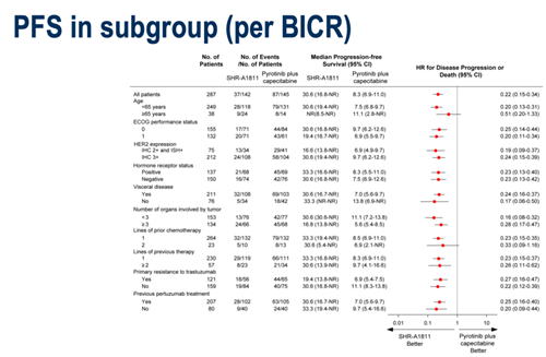 对于既往接受过帕妥珠单抗治疗的患者,瑞康曲妥珠单抗组的中位PFS为30.6个月(95%CI:16.7-NR),吡咯替尼联合卡培他滨组的中位PFS为7.0个月(95%CI:5.6-9.7),HR=0.25(95%CI:0.16-0.40)。对于既往未接受过帕妥珠单抗治疗的患者,瑞康曲妥珠单抗组的中位PFS为33.3个月(95%CI:19.4-NR),吡咯替尼联合卡培他滨组的中位PFS为9.7个月(95%CI:5.4-16.6),HR=0.20(95%CI:0.09-0.44)。