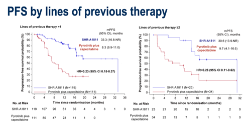 对于既往接受过1线治疗的患者,瑞康曲妥珠单抗组的中位PFS为33.3个月(95%CI:16.8-NR),吡咯替尼联合卡培他滨组的中位PFS为8.3个月(95%CI:6.9-11.0),HR=0.23(95%CI:0.15-0.37)。对于既往接受过≥2线治疗的患者,瑞康曲妥珠单抗组的中位PFS为30.6个月(95%CI:13.9-NR),吡咯替尼联合卡培他滨组的中位PFS为9.7个月(95%CI:4.1-16.6),HR=0.26(95%CI:0.11-0.62)。