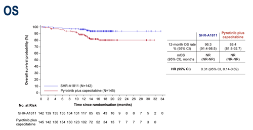研究达到了主要终点。BICR评估的中位PFS方面,瑞康曲妥珠单抗组达到30.6个月(95%CI:16.8-NR),吡咯替尼联合卡培他滨组为8.3个月(95%CI:6.9-11.0)。HR=0.22(95%CI:0.15-0.34,P<0.0001)。